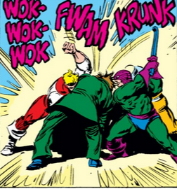 The Masters of Evil essentially decide that the way to defeat the Avengers is to divide them up, conquer, and take over the Avengers Mansion. They wait until the Mansion is pretty much deserted, and storm the place, managing to get in pretty easily, and take over the Mansion’s security and defenses. Apparently Tony Stark didn’t do that good of a job on the Mansion if the Fixer can easily bypass everything. Once inside the heavy hitters on the team beat the crap out of Jarvis and the Black Knight, tying them up with little resistance. Zemo decides that the most powerful member of the Avengers they’ll have to deal with is Captain Marvel, so they trick her into coming to the Mansion and have Blackout absorb her into the dark dimension that he can control, shutting her out from Earth, and the rest of the team. Captain America also gets a strange message to come to the Mansion, but decides that it wasn’t on the level, so he goes to talk to the Wasp and they decide to investigate it. When they get to the Mansion however they find that the Master of Evil’s great plan for Hercules was the get him drunk off his ass, and it was a rousing success. Cap and Wasp try to explain the situation to the shitfaced Hercules, but he doesn’t listen to them, and smashes his way into the Mansion to start some shit. And things don’t go well for Hercules. Up until this point in the comic, things weren’t going well for the Avengers, but this is where shit gets real. Goliath, Mr. Hyde, and the Wrecking Crew just straight up beat Hercules, pretty much to death.