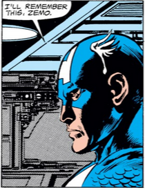 Back at the hospital Wasp realizes things aren’t going well, and calls in some reinforcements. Her and Ant-Man head back to the Mansion at the same time that Captain Marvel finally gets out of the dark dimension, by popping out of a weird character called the Shroud, and she blasts off to meet them. We also see Dr. Druid hanging out at home watching the news about the siege of Avengers Mansion, and he decides to come help as well. Thor shows up as well, and they launch their counter attack, burrowing in under the shell of darkness Blackout has surrounded the Mansion with. Meanwhile, Black Knight has gotten his sword back, and beats the crap out of Mr. Hyde, just as the cavalry shows up and starts taking the Masters of Evil down. Thor starts to fight the Wrecking Crew and Goliath as Dr. Druid shows up and uses his mind powers to get Blackout to drop the shell of darkness. One by one the Masters of Evil fall until the only one left is Zemo, trapped on the roof of the destroyed Mansion. Captain American and Zemo fight and Zemo pulls the old villain spite move of not taking Cap’s hand when he falls off the roof, plummeting to his…death? I’m pretty sure he doesn’t die, but the show him crumpled on the ground, and no one mentions his body. The military comes in to get rid of the Masters of Evil as the Avengers take stock of their destroyed home. The story ends with the Mansion in ruins, two Avengers and Jarvis in the hospital, and Captain America sitting in his trashed room looking through the shredded pictures of his friends and family, weeping. Downer.