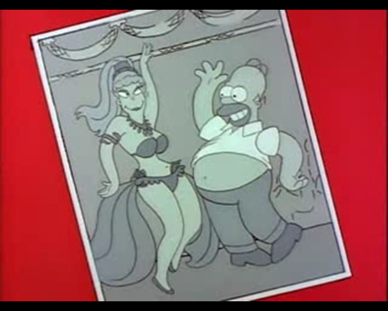 But Marge finally lets Homer come back, on the condition that he teaches Bart that treating women like objects isn’t acceptable. And they decide that the way to do that is find Princess Kashmir and teach Bart that she’s a real person, with her own thoughts and emotions and dreams. So Homer takes his ten year old son to every strip club in town! Homer and Bart go to some seriously sketchy places, where Homer is like a star from the picture, until they finally find the right cabaret that she’s working at. They go backstage, and talk with Princess Kashmir, who is seriously weirded out, but she gives him real answers, then, since it’s a comedy, Homer gets brought up in a giant bird cage (don’t ask) and falls out into the crowd during the burlesque show. The crowd then begins to hoot and holler, but Homer stops them and gives a pretty great speech about respecting women, complete with the amazing line “I would rather feel the breath of my wife on the back of my neck as I sleep rather than stuff dollar bills in a strangers g-string.” Ah, true love! The crowd starts to weep as Marge shows up and kisses Homer, leading Bart to close out the episode by saying “only sick people want to see my folks kiss.”