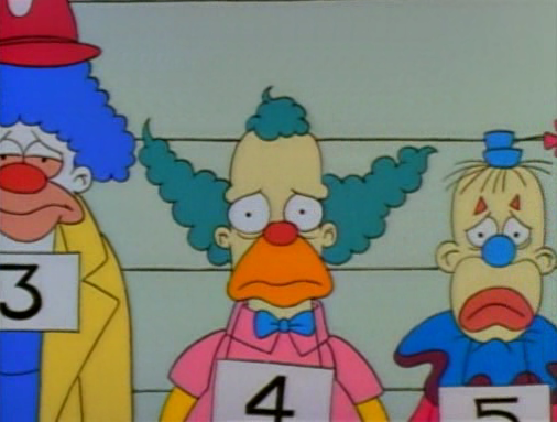 I love the meta joke Lisa makes when Marge complains about Itchy and Scratchy, claiming that “If cartoon’s were meant for adults, they’d out them on at primetime” The Simpsons was probably the first place that I ever even came across the concept of meta-humor. I’m sure as a kid I just thought that that was a weird thing for Lisa to say, but it’s really emblematic of the weird humor the Simpsons thrived on. We get into the heart of the episode when the family finds out that Patty and Selma are coming over that night to show the family their slides from their recent trip to Mexico, and Marge sends Homer to the Kwik-E-Mart to get some ice cream. While in the store Homer chats to Apu, and doesn’t seem to notice that there appears to be Krusty standing in the corner, reading a magazine with a mask on. But they finally do notice it when he pulls out a gun, and robs the Kwik-E-Mart, making Homer dive into a display of chips to hide. So, in college I worked at a relativly sketchy Best Buy, and I was held up once when two dudes came in to rob the place, and I had a gun pointed at me. Not fun. But I love that Apu is so used to it that he doesn’t even seem intimidated. Homer tells the cops that it was Krusty, and they quickly arrest him. It made me laugh really hard when Wiggum just started saying “blah, blah, blah” during the Miranda rights. Homer then fingers Krusty in a lineup of sad clowns, and he’s sent to jail to await trial.