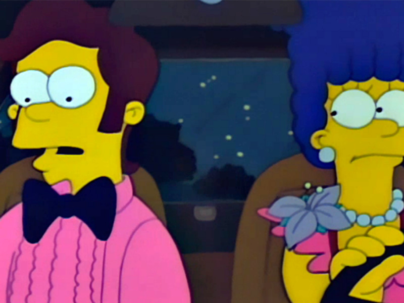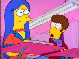 Back at school, Artie decides to ask Marge to the prom, and since she canceled with Homer, she takes him up on it. Of course, Homer doesn’t realize that she canceled, so he’s still preparing to go with her. She then starts to get ready for prom, and we get the great line from Mrs. Bouvier, “ladies pinch, whores use rouge.” While Marge is getting ready Homer shows up and we get to see teenaged Patty and Selma and Marge’s dad, who are all ashamed that Marge picked Homer. She comes down and is shocked to see Homer, and he has to leave in embarrassment when Artie comes to pick her up. So they all head to the prom, which is “Goodbye Yellow Brick Road” themed. Marge and Artie have a great time, and they’re even crowned King and Queen. While Homer skulks around by himself, growing more and more depressed. I never went to prom in high school, half because I never have a shit about that sort of stuff, and half because I was a loser and never could get a date, so prom stories never have that much weight to me. They just seem like such frivolous and stupid things. But whatever, people like them.
