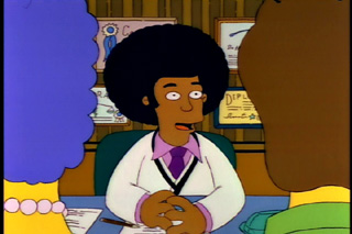 Before the flashback starts we get a great joke with the family sitting around watching some sort of parody of the Siskel and Ebert show, where they’re talking about McBain. I love the McBain movie that we always see clips of. I’ve seen a video where someone spliced all the disparate clips of McBain together to make a somewhat followable narrative, and it’s great. Anyway, while they’re watching the show the TV goes on the fritz, so Homer does what any man would. He starts smacking the hell out of it. But shockingly that didn’t work, and he ends up breaking the TV. While Bart becomes mired in dispair, Homer and Marge begin telling the kids stories. Lisa first asks how Homer proposed, but all that leads to is a flashback where Homer and Marge is told by Dr. Hibbert that she’s pregnant, since they had a shotgun wedding. I love that one constant in flashback episodes is that you can always tell the era by whatever hairstyle Dr. Hibbert has, in this case a big-ass afro.
