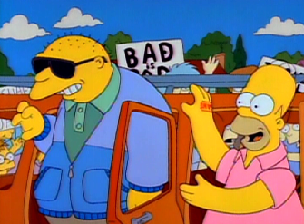 Well, Season 3 starts off with another amazing sibling episode, and a great guest appearance. That’s right, the Leon Kompowsky! It’s also a really weird episode about conformity and insanity. Let’s jump right in. We start with Lisa waking Bart up by pinching his nose and having him struggle to breathe, which is such a sibling move. Bart then assumes that the reason Lisa woke him up was that Homer was dead, and he’s shocked that he’s relieved Homer’s okay. But it turns out that the reason Lisa has woken him up is that Bart never gets her any birthday presents, never even seems to acknowledge her birthday, and she’s desperate for him to actually give a damn, and he says that he will. Which seems like a strange thing, to me at least. My brother and I only started buying things for each other on birthdays a year or two ago, definitely not when we were kids. Anyway, we cut down to the kitchen, where it turns out all of Homer’s workshirts have become pink, because Bart put his lucky red hat in with the whites. Homer is terrified of wearing the shirt to work, thinking that everyone will make fun of him for wearing pink. But Marge convinces him that everything will okay.