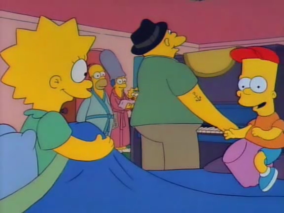 Lisa is incredibly mad at Bart, even writing him a letter saying that they’re siblings in name only now, and Bart is frustrated, because he clearly doesn’t want Lisa to be mad, but doesn’t know what to do. And then Michael comes to rescue! He suggests to Bart that they write a song for Lisa, and after some complaining on Bart’s part, since it’s not the real Michael Jackson, he agrees, and the two get to work. It’s clear that Bart needs help, because the initial song he writes, while hilarious, is terrible. “Lisa, her teeth are big and green, Lisa she smells like gasoline, she is me sista, her birthday, I missta.” So they stay up all night, with Michael doing most of the work, but Bart giving some great input, mainly about what it’s like being 8 years old, and what it’s like to have her in his life. Then the next morning they drag the piano up to Lisa’s room, and after Bart wakes her up by plugging her nose like she did, they start playing the song. And man is “Lisa it’s you Birthday” an adorable song. And it was in my head like crazy after. It was a beautiful moment. And while they’re singing the rest of the family wakes up, including Homer who is apparently sleeping with his “Not Insane” certificate. They all come to listen, and Lisa loves it, jumping to Bart to hug him. Then, like magic, Michael Jackson is gone, and the true man, Leon Kompowsky is back. He admits that he had a nervous break, and started acting like Michael Jackson, but he’s apparently cured now, and heads out on his own, happy that he helped fixed Bart and Lisa’s relationship.