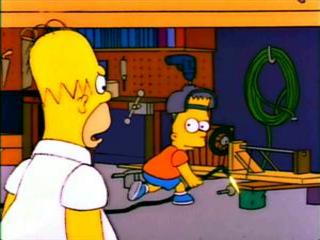 Weird, two episodes in a row that are about Homer’s relationship with his kids being bad. That seems odd. Also, this one wasn’t as good in my opinion. Oh well, it does have a pretty great chalkboard gag with “I will not fake rabies.” The episode starts up with Homer watching an infomercial called “I Can’t Believe They Invented It,” where Troy McClure gets Dr. Nick to shill some crap. In this case it’s a magical stain cleanser that Dr. Nick demonstrates its power by cleaning the grime off the tombstone of Edgar Allen Poe, which would certainly sell me on a cleanser. Homer is of course fixated by Dr. Nick’s miracle cleanser, and is ready to buy it, while we start to see Bart busying himself by building something in the garage. Patty and Selma show up to get Marge’s advice on hairstyling while Homer orders some cleanser and ignores Bart, and when the three head off to the beauty salon, she tells Homer to spend time with the kids. So Homer takes Lisa and Maggie to the video store, which in incredibly antiquated thing already, but leaves Bart since he’s busy welding something in the garage.