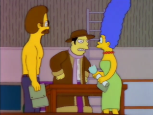 So she heads off to the audition for the amazingly named “Oh, Streetcar!” and we get to see the random assortment of townsfolk that come to audition. We even get to see Jasper doing dancing stretches and prancing around like a ballerina. We’re then introduced to yet another weird Jon Lovitz character, the director of the play Llewellyn Sinclair. And while Sinclair probably isn’t as memorable as Artie Ziff or Professor Lombardo, he’s still pretty great and insane. He lets the people know that he’s incredibly strict and has high standards, since his grade-school play was enjoyed by all, which intimidates Marge. The men then take their shirts off to audition for the role of Stanley, since having no shirt is the most important part of that role, and it goes to Ned Flanders, since apparently he’s ripped, which is always a funny joke, but I think one that works better with Willie than Ned. Then it’s time to audition the Blanche’s, and Marge barely gets a bar out before Sinclair shoots her down, saying that she doesn’t have the frailty needed for the role. But then as Marge heads over to a phone and calls Homer, admitting that ambitions are stupid and that she’s wasting her time, Sinclair changes his mind and decides Marge is perfect for the part.