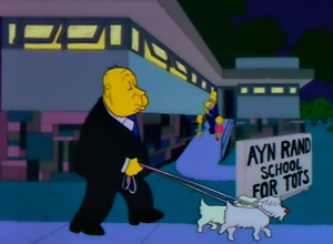The rehearsals then begin, and boy is the cast for “Oh, Streetcar!” crazy. We have Marge, Ned, Helen Lovejoy, Otto, Apu, Lionel Hutz (who is also suing Sinclair on behalf of the people who didn’t make the audition), and Chief Wiggum. They begin rehearsing, starting right off with the rape scene, but things start to get ruined when Maggie starts wrecking the rehearsal by playing around on the bed. So Sinclair recommends sending Maggie to the daycare that his sister runs. Which turns out to be a crazy objectivist place called the Ayn Rand School for Tots, which is a terrible idea. And Maggie is instantly not cool with the place, since they won’t let her use her pacifier. And without Maggie the rehearsals continue, as we get to see a variety of insane outfits Sinclair wears, and Marge struggling with the role. It also doesn’t help that Homer is being a complete ass at home, just sitting in bed playing a bowling game on a big-ass old school Gameboy while Marge is trying to talk about the play. He even acts like going to the play will be a big pain in the neck for him.