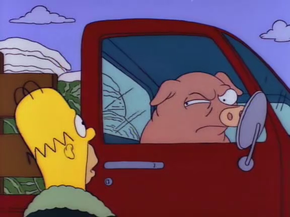 We begin this episode with Homer hanging out at Moe’s watching some crazy show called Carnival of the Stars, that’s just celebrities doing weird tricks in beautiful Molokai Island, It’s Not Just for Lepers Anymore! It’s of course hosted by the always wonderful Troy McClure, and I think his best role this time was “Dial M for Murderousness.” And the show is so captivating that Homer stays at the bar way longer than he should watching it, and when he finally leaves a blizzard has rolled in, and he has to make his way home in a white-out. I’ve lived in Denver my whole life, and man is driving in snow no fun. I would honestly rather drive in snow and ice than hydroplaning torrential downpours, but it’s still no fun, especially in a white-out. And of course, since Homer’s been out all night drinking and driving in a blizzard, he ends up hitting another car…that turns out to be Marge’s. At least he made his way home. The next morning, as a tow-truck drags away the two totaled cars Homer has to speak with an insurance agent, and decides that he shouldn’t tell the man that he was at a bar, so tells him Moe’s is a “pornography store. I was buying pornography.”