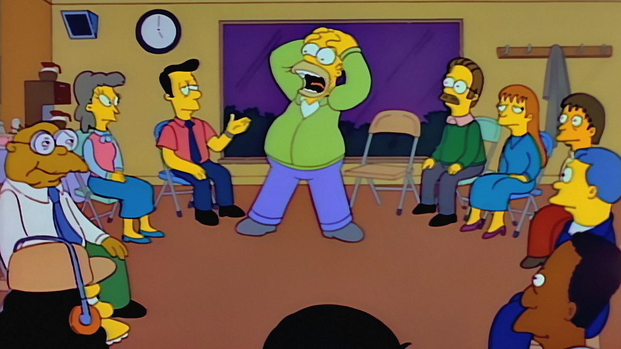 Back in Homer’s plot, he’s sitting through traffic school, which is just watching a video hosted by Troy McClure (Alice’s Adventures Through the Windshield Glass is the one that got me this time) that’s apparently just footage of car accidents with zany music playing. He also attends an AA meeting in the church basement where we learn that Ned Flanders is 4,000 days sober after getting tipsy and insulting Ann Landers, and that Hans Moleman is only 31 years old and has a rough life. Homer thinks the whole program is a joke, and doesn’t take it seriously, but Marge becomes convinced that Homer actually does have a drinking problem, and has him agree not to drink beer for a whole month. And after briefly seeing Bart fainting before grabbing some cupcakes because he has a Clockwork Orange operant conditioning thing going on, we see Homer pouring out all his beer while singing a version of the Frank Sinatra “When I was Seventeen” song.