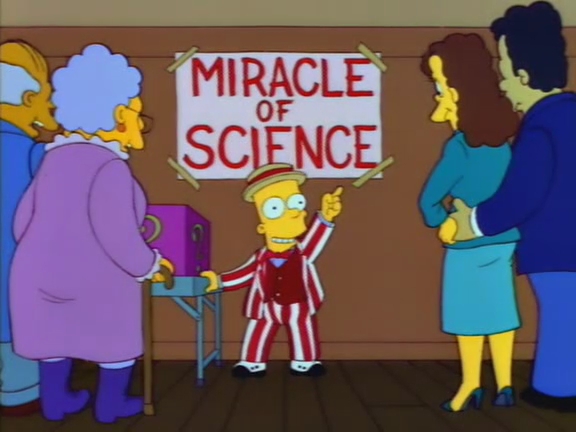 The Lisa/Bart plot comes to a head when Bart is walking through the house and finds Lisa’s notebook that details the experiment in her room. He gets mad and decides to get revenge, hiding the notebook and waiting for Lisa in her room with the hamster like he’s a Bond villain. She quickly finds the book though, so he decides to escalate his revenge. We pop over to the Science Fair where we some of the other kids terrible projects. Milhouse just uses a Slinky and talks about gravity, Martin has a hot-air balloon which Nelson pops with a pellet gun, and Ralph has a little alcohol powered car, which gets Homer thirsty. We then see Bart’s revenge fueled project, which is just flying the hamster around in a remote controlled plane while dressing like an old timey circus barker. And unfortunately for Lisa Bart gets first prize, because as Skinner says, every scientist is half BF Skinner and half PT Barnum.