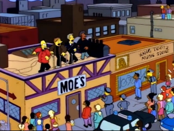 They’re starting to dislike each other, and Barney gets super pretentious and gets a Yoko Ono girlfriend. Then the death knell happens, and Us Weekly labels them “not hot” in their magazine. So they break up and just go back to their old jobs. And man do I laugh hard when Barney shows up with Yoko at Moe’s and they ask for a beer and a single plum floating in perfume served in a man’s hat. And Moe just has both of those ready to go. The story is then over, and the kids obviously have a ton of question, just like the audience should. Not a lot of it makes sense, especially them not remembering those months when their father was one of the most famous people in the country. But Homer just ignores them, and sends them to bed. But just as he’s about to put the record away and forget the band again, he gets nostalgic and call the band up. They meet on the roof of Moe’s and reenact the classic rooftop concert the Beatles did at the end of their career. And it’s wonderful, especially George Harrison just driving by to dismiss them, and Chief Wiggum getting ready to tear gas them out of spite.